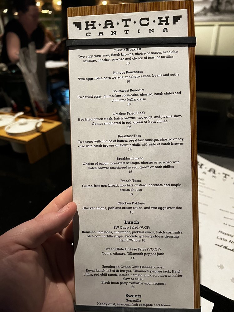 “ Food - Food comes out in fairly large portions. Egg was overcooked for our order. 'Hatch browns' are very crispy but underseasoned, you'll have to add some salt if you like a bit of flavor. Overall filling meal. Service - Fast ordering and simple ordering. Menu is digital. Ambiance - Americanized cantina with large windows for light during the daytime. They also have a bar for some night life drinks. ”